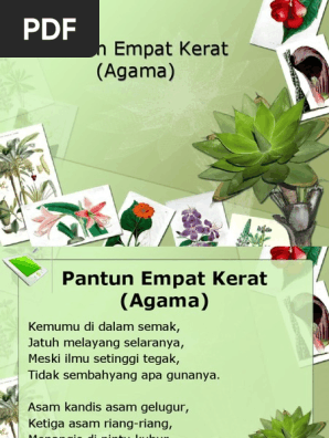 Pantun empat keratbuah cempedak di luar pagar,ambil galah tolong jolokkan,kami budak baru belajar, kalau salah tolong tunjukkanpisang emas dibawa belayar,masak sebiji di atas peti,hutang emas boleh dibayar,hutang budi di bawa mati. Jangan bermain kekasih orang, nyawa tersangkut di hujung kuku. Gaharu,cengal,giam , tak tahu , tak kenal , diam. Ada kolam ada masjid, tempat orang sembahyang raya, tengah malam bulan terbit, bingtang sebiji membawa cahaya. Kayu cendana diatas batu sudah diikat dibawa pulang adat dunia memang kerat kerat kayu diladang hendak dibuat hulu cangkul berapa berat mata memandang barat lagi bahu memikul. Air surut memungut bayam, sayur diisi di dalam kantung, jangan diikat resmi ayam, bertelur sebiji riuh sekampung. Download lagu pantun nasihat mp3 gratis dalam format mp3 dan mp4. Misalnya, baris kedua dan keempat pada bait pertama, akan menjadi baris pertama dan baca juga: Maka, pemilihan maksud pantun adalah berbentuk nasihat tentang pembentukan akhlak dan sahsiah diri. Pantun nasihat lebih kepada nasihat pasal kehidupan kita sebagai hamba yang selalu lalai tentang kelebihan bila kita beribadah. Pantun empat kerat docx document. Kumpulan contoh pantun jenaka, pantun nasehat, teka teki, agama, pendidikan, cinta, romantis, persahabatan, perpisahan, ulang tahun, anak dll. Akar keladi melilit selasih, selasih tumbuh di hujung taman, kalungan budi junjungan kasih, mesra kenangan sepanjang zaman.
