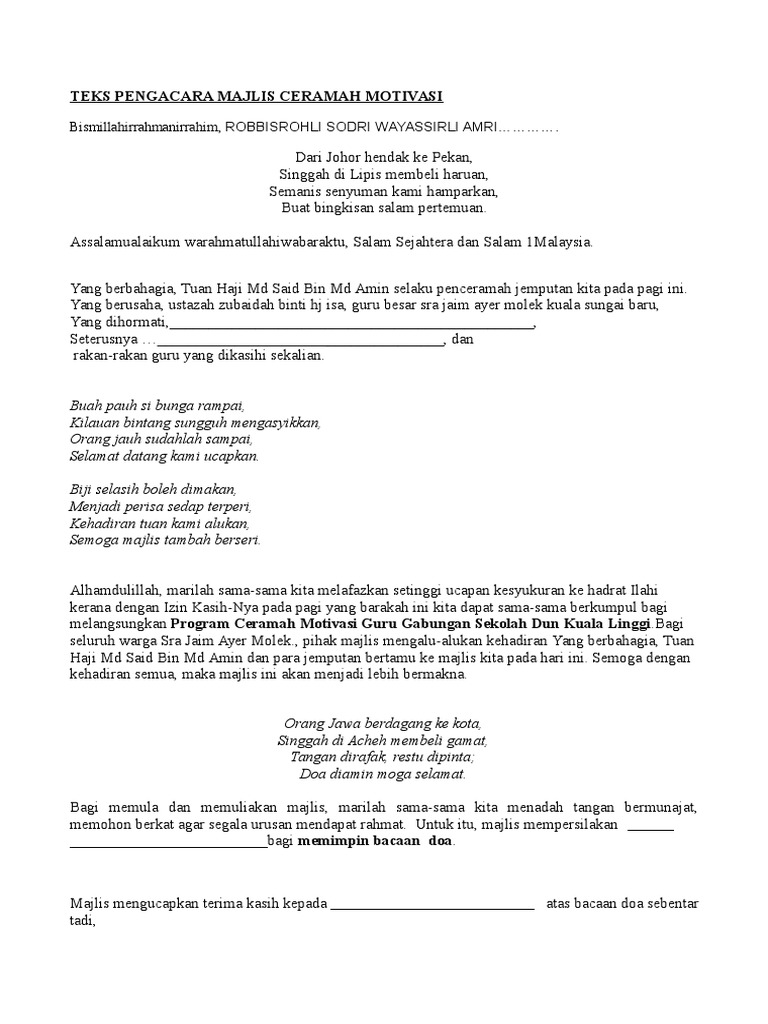 Setelah teks disiapkan, pengacara perlu menjalani latihan, terutama dari segi kejelasan sebutan dan intonasi suara. Teks pengacara majlis ceramah agama. Teks pidato tentang pengaruh media sosial bagi pelajar; Membawakan dari auditorium seri perdana ,pertandingan pidato peringkat daerah jasin melaka bandaraya bersejarah. Majlis menjemput tuan penceramah, tuan haji nazmi bin md noor untuk memberikan ceramah. Teks pengacara (stephanie unsil rakey) majlis penutupan kem motivasi kecemerlangan upsr peringkat sk skarok 2016 dan hari permuafakatan bersama ibu bapa sk skarok 2016 anak embang, guru besar bagi menyempurnakan upacara penyampaian sijil penghargaan. Bertemu kita sekali lagi untuk meneruskan sesi kedua ceramah kita pada hari ini saya serahkan semula majlis kepada puan penceramah kita, pn. Teks untuk digunakan oleh pengacara majlis sewaktu ceramah motivasi di sekolah. Posted by unknown at 06:46. Teks ucapan pengerusi majlis bacaan yasin lucu ora. Scribd adalah situs bacaan dan penerbitan sosial terbesar di dunia. Contoh soal for example contoh kata aluan. Teks pengacara majlis ceramah motivasi tahun 6 2015 download documents for more information and source, see on this link :